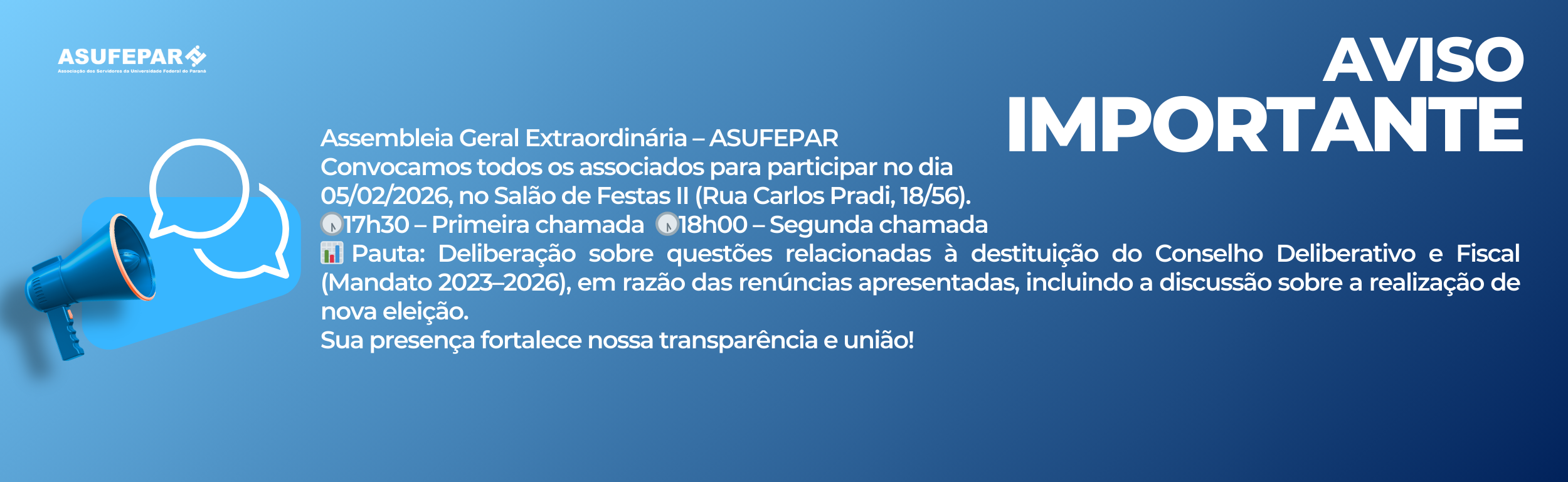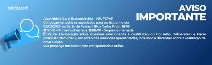 A ASUFEPAR convoca todos os seus associados para participarem da Assembleia Geral Extraordinária, que será realizada no dia 05 de fevereiro de 2026 (quinta-feira), no Salão de Festas II da ASUFEPAR.